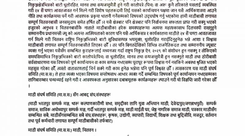 सम्माननीय प्रधानमन्त्री तथा चितवन क्षेत्र नं. ३ को निर्वाचित पूर्व सांसद चितवन निवासी सम्माननीय पुष्पकमल दाहाल(प्रचण्ड) ज्यू को विगत लामो समयदेखिको माडी तथा चितवनका सबै क्षेत्रको विशेष चासो, सद्भाव, माया तथा संलग्नताले गर्दा नै चितवन जिल्लाको दिगो विकासमा दिनानुदिन विकासको चरणले फड्को मार्दै गएको तथ्यलार्इ चितवनबासीले बिर्सन सक्दैनन् । यहाँले प्रधानमन्त्रीको हैसियतमा बैशाख ३१ गते पूर्व पश्चिमराजमार्गको नवलपुर जिल्लाको गैंडाकोट र चितवन जिल्लाको नारायणगढ जोड्ने खण्ड (नारायणीपुलको) सिग्नेचर पुलको सिलन्यास कार्यक्रममा सम्बोधन गर्नु हुँदै त्यसै अवसरमा चितवन जिल्लाको बिकट क्षेत्रको रूपमा नामाङ्कित भएको माडी र यस चितवन राष्ट्रिय निकुञ्जक्षेत्रहुँदै ठोरीसम्म पुग्ने हुलाकी सडकखण्ड मध्ये निकुञ्जक्षेत्रभित्रको बाटो धुलोरहित, मानव तथा वन्यजन्तुमैत्री हुने गरी कालोपत्रे (पिच) वा अरू कुनै तरिकाले यसलार्इ व्यबस्थित गरी २४ सैं घण्टा आवतजावत गर्न मिल्ने गरी विशेष पहलकदमी लिर्इ यसको कार्यान्वयन पक्षमा जान यसै आर्थिकशत्रमा आउने नीति तथा कार्यक्रममा पर्ने गरी आवश्यक प्रकृया थालनी गर्नेसम्मको विषयको उद्घघोष गर्नु भएकोमा हामी माडीबासी लगायत सम्पूर्ण चितवनबासी जनसमुदाय समेत हर्षित छौँ ।र यसै क्षेत्रबाट पनि क्षेत्रबाट पनि निर्वाचनमा सफलता प्राप्त गरी सक्नु भएको हजुरको अनुभव र चितवनबासीकै नाताले माडीबासीका हरेक समस्याहरूमा अत्यन्त महत्वकासाथ दिलचस्पी राख्नुहुने सम्माननीय प्रधानमन्त्री ज्यू को अत्यन्त आत्मियताको कारण पनि यसै आर्थिकसत्र र कार्यकालमा माडीले २४ सैं घण्टा आवतजावत गर्न मिल्ने गरी चितवन राष्ट्रिय निकुञ्जभित्रको बाटो सुविधासम्पन्न भयमुक्त, धुलोरहित गरार्इदिनुहुनेछ भन्ने आशा र विश्वास माडीबासी लगायत सम्पूर्ण चितवनबासीले लिएका छौँ । तर पनि बिगतदेखिको विभिन्न राजनैतिकदल तथा सम्माननीय ज्यूबाट व्यक्त गर्नु भएका यसैसँग सम्बन्धित कुराहरूलार्इ मध्यनजर गर्दा राष्ट्रय निकुञ्ज ऐन, २०२९ को संशोधन हुन नसक्नु र तोकिएको समयसिमाभित्र निकुञ्जभित्रको बाटो कालोपत्रे(पिच) वा धुलोरहित, मानव तथा वन्यजन्तुमैत्री हुन नसक्नुले माडी तथा ठोरीबासी सर्वसाधारणमा यस विषयको पूर्ण कार्यान्वयन वा काम सम्पन्न नभएसम्म पूरापूर रूपमा विश्वास गर्न नसकिने अबस्था श्रृजित भएको महसुस गरेका छौँ, त्यस्तो वातावरणलार्इ चिर्न सक्ने गरी काम हुनेछ भन्नेमा पनि पूर्ण विश्वस्त छौँ । त्यसकारण यस माडी संघर्ष समिति (मा.स.स.) ले हाल व्यक्त भएका विषयमा सन्तोषसाथ आभार व्यक्त गर्दै सम्बन्धित विषयको पूर्ण कार्यान्वयन नभएसम्मका लागिबारम्बार घच्घच्यार्इ रहने 