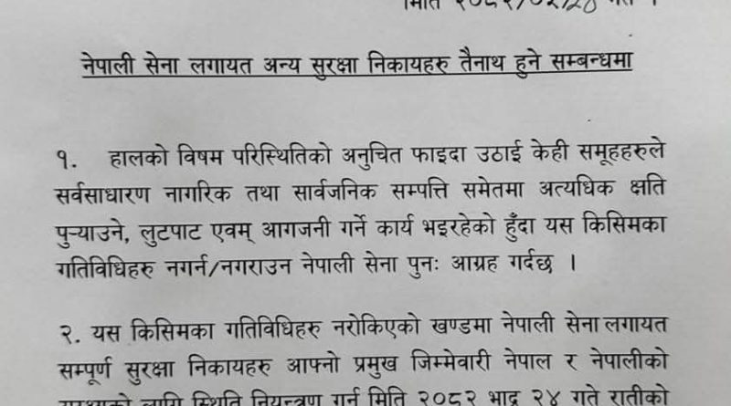 नेपाली सेनाले राति १० बजे देखि शान्ति सुरक्षा गर्ने