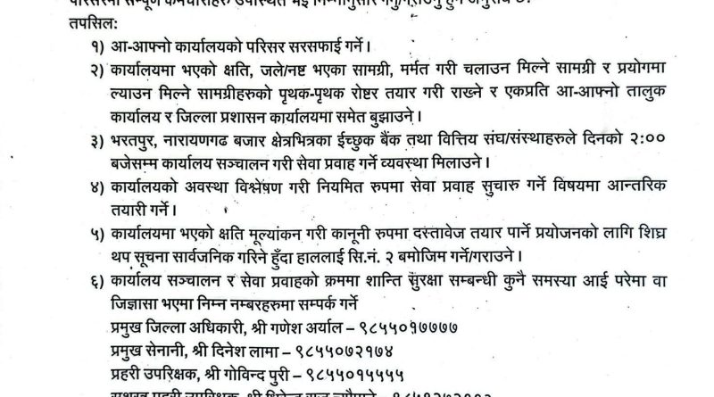 जिल्ला प्रसासन कार्यलय चितवन बाट सबै कार्यलयहरूलाई पत्र मार्फत कार्य आदेश