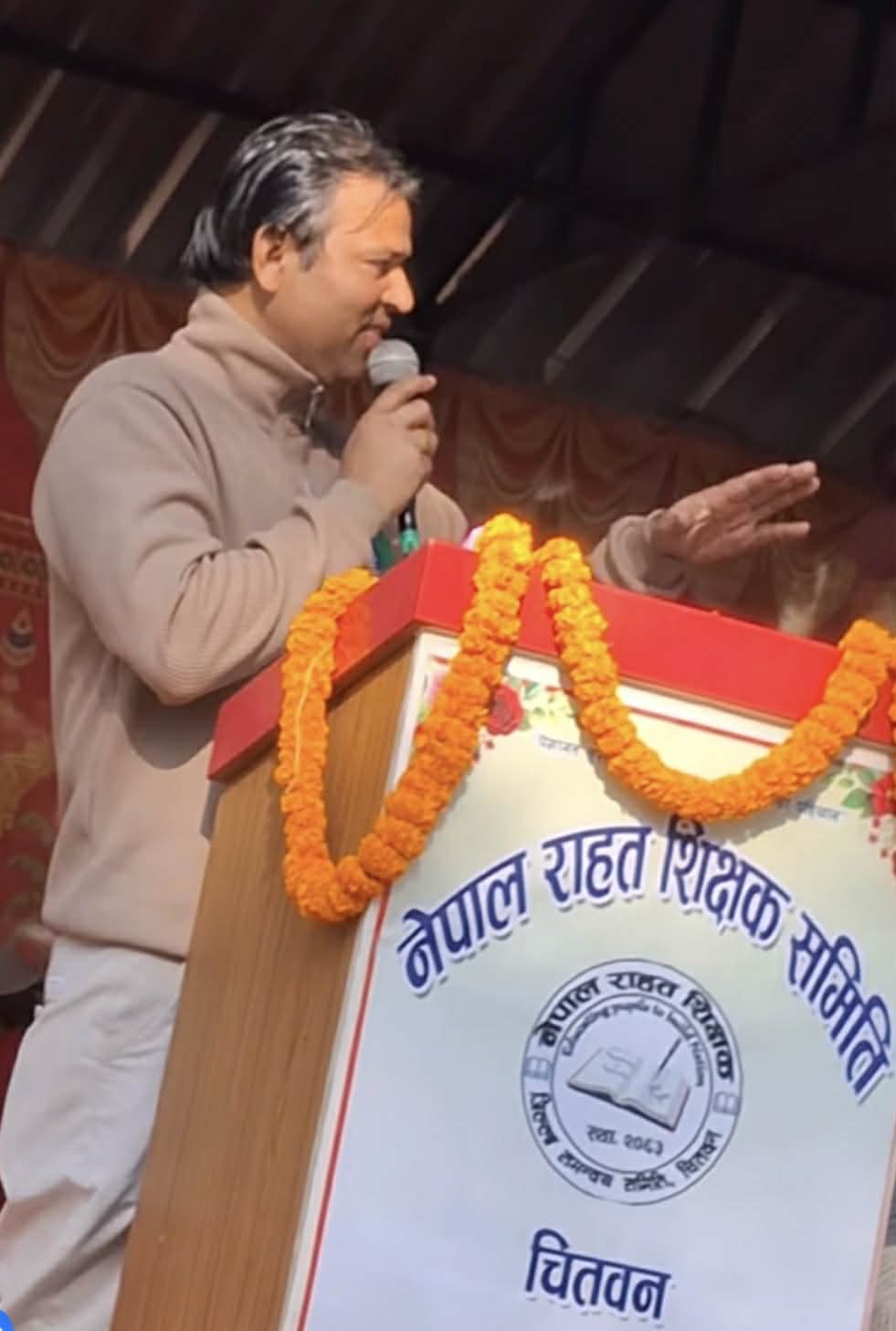 नेपाल राहत शिक्षक समिति चितवनका सल्लाहकार समिति संयोजक एवं पुर्व अध्यक्ष श्री शिव प्रसाद लम्सालले आफ्ना मन्तव्यका क्रममा विगत देखि वर्तमान अवस्था सम्म राहतले भोग्नुपरेका विभिन्न समस्याहरु बताउनुभयो I