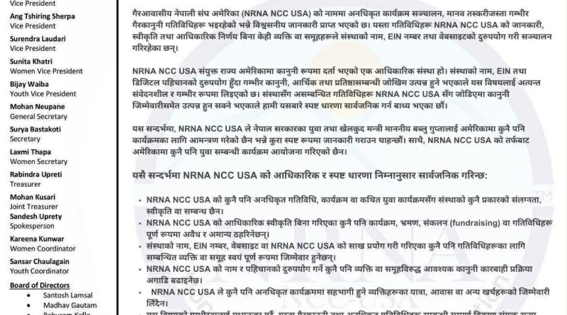 विज्ञप्तिमा भनिएको छ, एनआरएन अमेरिका को आधिकारिक जानकारी, स्वीकृति तथा निर्णय बिना कुनै पनि व्यक्ति वा समूहले संस्थाको नाम, ईआईएन नम्बर, वेबसाइट वा डिजिटल प्लेटफर्म प्रयोग गरी कार्यक्रम, आर्थिक संकलन वा अन्य गतिविधि सञ्चालन गर्नु गैरकानुनी हो र त्यसको पूर्ण जिम्मेवारी सम्बन्धित व्यक्ति वा समूह स्वयं हुनेछन्। नेपाल सरकारका युवा तथा खेलकुद मन्त्री माननीय बब्लु गुप्तालाई अमेरिकामा कुनै पनि कार्यक्रमका लागि आमन्त्रण गरिएको छैन, न त एनआरएन अमेरिकाले अमेरिकामा कुनै युवा सम्बन्धी कार्यक्रम आयोजना गरेको छ । संस्थाका प्रवक्ता सन्देश उप्रेतीले जारी गरेको विज्ञप्तीमा विषयको गम्भीरतालाई मध्यनजर गर्दै यस्ता गैरकानुनी गतिविधिबारे अमेरिकी होमल्याण्ड सेकुरेटी तथा नेपालस्थित अमेरिकी दूतावासलाई औपचारिक जानकारी गराइसकिएको संघले जनाएको छ।
