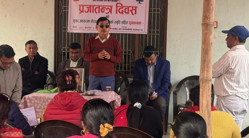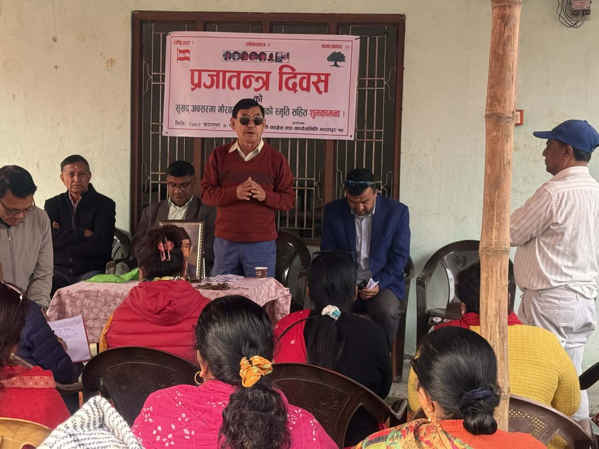 नेपाली काग्रेँस भरतपुर महानगर पालिका वडा नं १०का सभापति गणेश गुरूङ्गले वडाकाे क्षेत्रिय प्रतिनिधिलाई फाल्गुण७ गते प्रजातन्त्र दिवसकाे अवसरमा सबैलाई शुभकामना सम्बाेधन गर्नु हुँदै । February 19, 2026 chirfarkhabar Spread the love