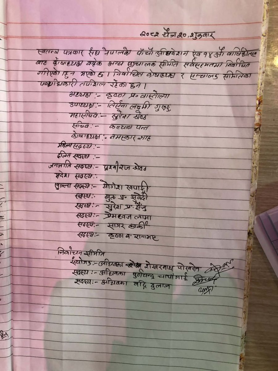 , सचिव पदमा कल्याण पन्त ,कोषाध्यक्षको नमस्कार शाह महिला सदस्य, दलित सदस्य र मधेश सदस्यमा उमेदवारी नै परेन भने जनजाति सदस्य पदमा पृथ्वी राज श्रेष्ठ, खुल्ला सदस्यहरु योगश खपाङ्गी, मुक्त प्रसाद सुवेदी, सुरेश प्रसाद सैँजु, प्रेपध्वज लामा, सागर कार्की, कृष्ण बहादुर रानाभाट निर्विरोध निर्वाचित । निर्वाचन समितिमा संयोजक अधिवक्ता शेखरनाथा पाेख्रेल ,सदस्य अधिवक्ता पूर्ण चन्द्र चापगाई, सदस्य बद्रि दुलाल रहनु भएको थियो ।