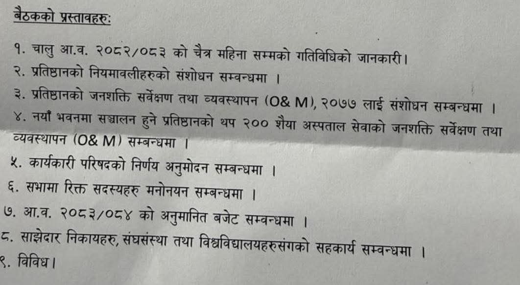 मदन भण्डारी स्वास्थ्य विज्ञान प्रतिष्ठानका कुलपति माननीय मुख्यमन्त्री इन्द्रबहादुर बानियाँ अध्यक्षतामा मदन भण्डारी स्वास्थ्य विज्ञान प्रतिष्ठान हेटौंडाको दशौं सभा बैठक, हेटौडा । सभामा सहकुलपति एवं स्वास्थ्यमन्त्री किरण थापा, प्रदेशसभा सदस्य एकालाल श्रेष्ठ, उपकुलपति डा. प्रदीप जवाली, स्वास्थ्य मन्त्रालयका सचिव डा. सुमित्रा गौतम, मुख्यमन्त्री तथा मन्त्रिपरिषद्को कार्यालय सचिव लोकेन्द्र बराल, सामाजिक विकास मन्त्रालयका सचिव खुवीराम अधिकारी, आर्थिक मामिला तथा योजना मन्त्रालयका निमित्त सचिव नुमानन्द अधिकारी, मदन भण्डारी स्वास्थ्य विज्ञा प्रतिष्ठानका शिक्षाध्यक्ष प्रा. डा. दिनेश कुमार लम्साल, डिन सह प्रा. डा. इन्दिरा अधिकारी, निर्देशक सह प्रा. डा. रामचन्द्र सापकोटा, रजिस्ट्रार भिम सागर गुरागाईं, स्वास्थ्य निर्देशनालयका वरिष्ठ जनस्वास्थ्य अधिकृत जितेन्द्र कुमार साहलगायतको उपस्थिति रहेको थियो ।